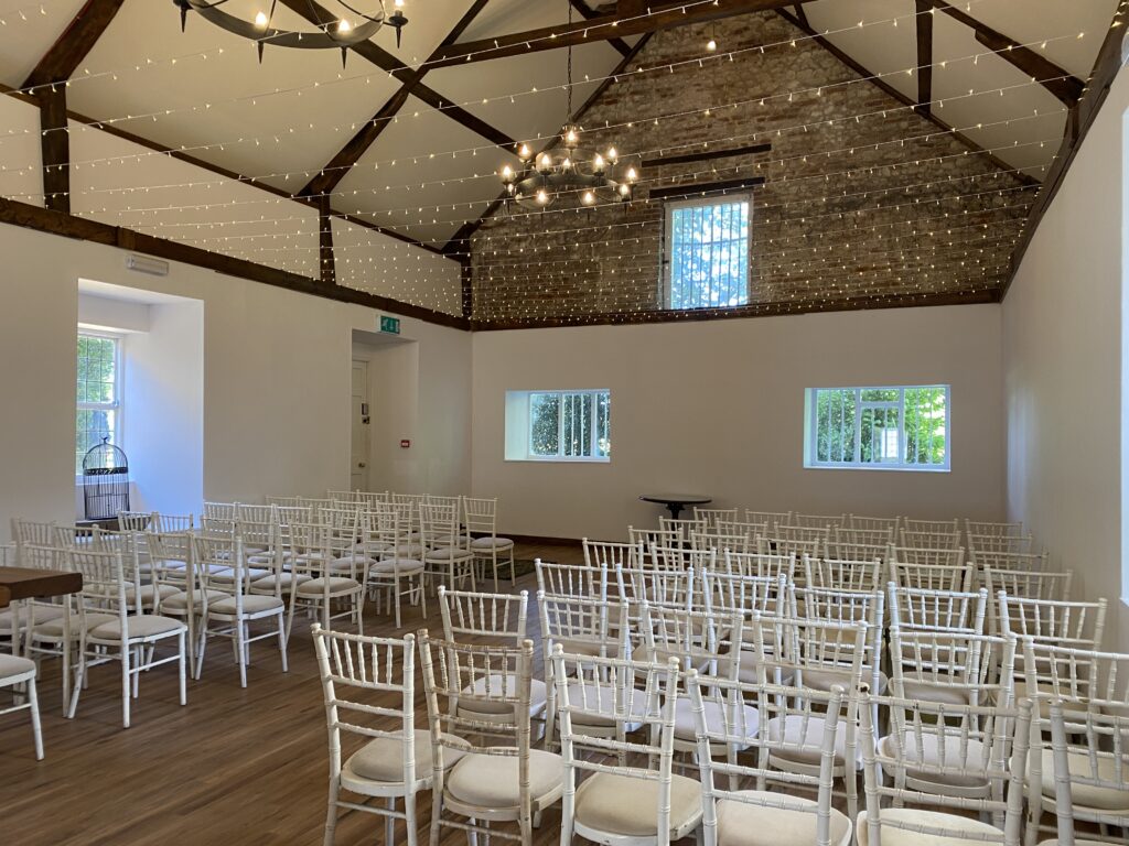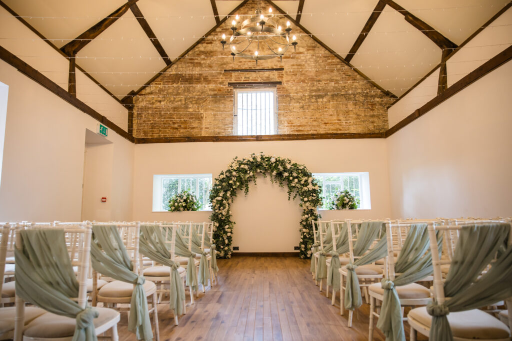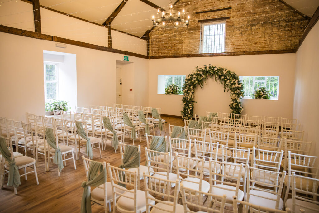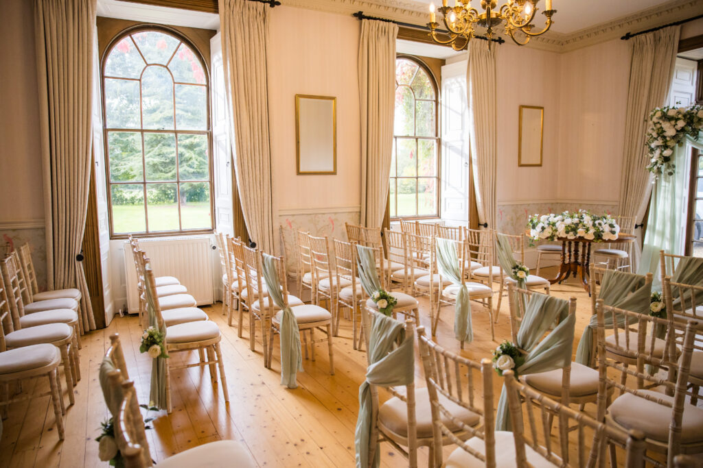 Our civil ceremony room can hold up to 90 guests, however, it can also be made into a more intimate space for smaller weddings. Whatever the size of your ceremony, Hockwold Hall’s civil ceremony room has neutral décor so your personal wedding colour scheme can stand out.