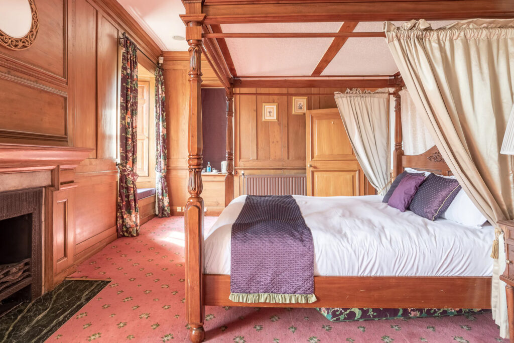 Generously sized bedroom enclosed in traditional wood-paneled and gentle cream walls. The room features a fireplace, ornate super king-sized four-post bed. Floral print decor in rich deep purple with gentle peach & sage green accents create a soothing space for relaxing and the antique vanity unit makes for a lovely area to prepare for any special event. South-facing views from a window seat, or another, from a large sash window of which guests can step onto a large roof-top balcony with stunning views of Hockwold Hall’s walled garden.