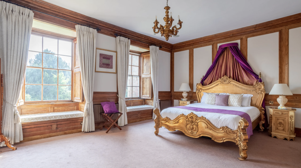 An opulent and spacious bedroom inspired by one of Hockwold Hall’s previous owners Prince Victor Duleep Singh. This bedroom is adorned in regal purple and gold pallet, the theme was inspired by a description found about the space in the early 1900s of the Princes’ office containing purple velvet on the walls. 360-degree wood and cream accented paneled walls, the ornate gold french inspired super king bed is both luxurious and comfortable. This room features a lovely marble fireplace with ornate iron artwork. Beside is a vanity paired with a full-length mirror and plush velvet seating. The two large south-facing sash window seats provide comfort, stunning views of Hall’s walled garden, and the natural light create lovely photo opportunities!