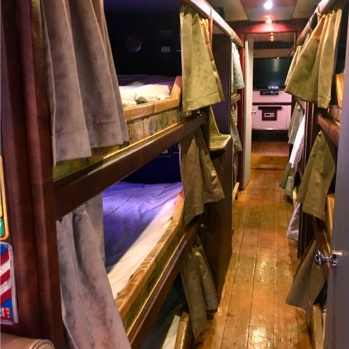 This Route 66 themed bus has 12x Single Cabins with 2 lounges